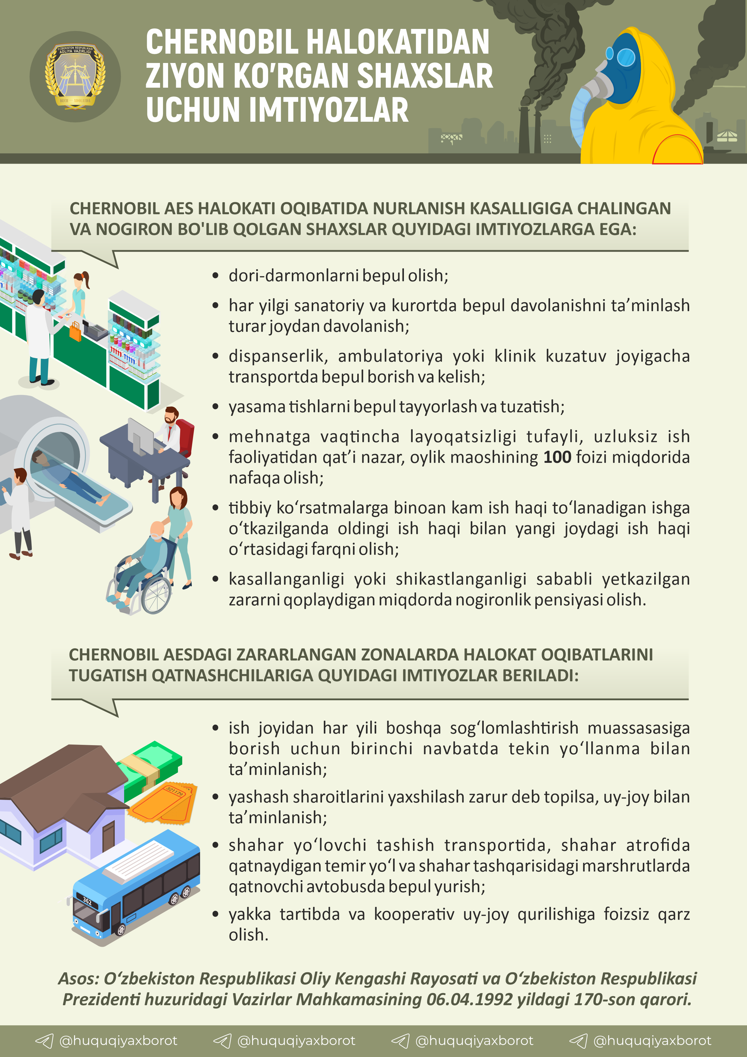 Вазирлар Маҳкамасининг 1992 йил 6 апрелдаги "Чернобиль ҳалокатидан зиён кўрган Ўзбекистон Республикасида истиқомат қилувчи фуқароларни ижтимоий ҳимоялаш ҳақида"ги Қарори билан Чернобиль ҳалокатидан зиён кўрган Ўзбекистон Республикасида истиқомат қилувчи фуқароларга бериладиган ҳақ-ҳуқуқлар, компенсация пули ва имтиёзлар рўйхати тасдиқланган.